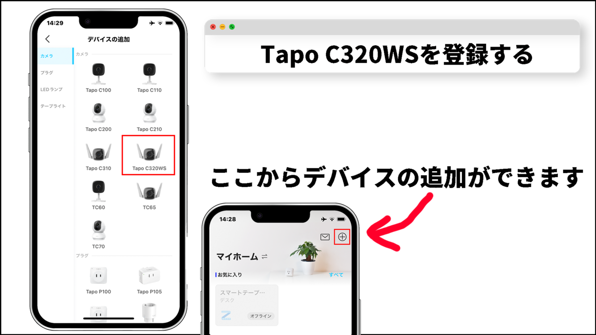 画面右上のプラスボタンを押すとデバイスの一覧が開くのでカメラ欄のTapo C320WSを選択しましょう。