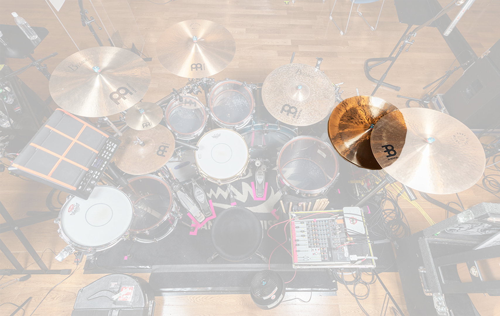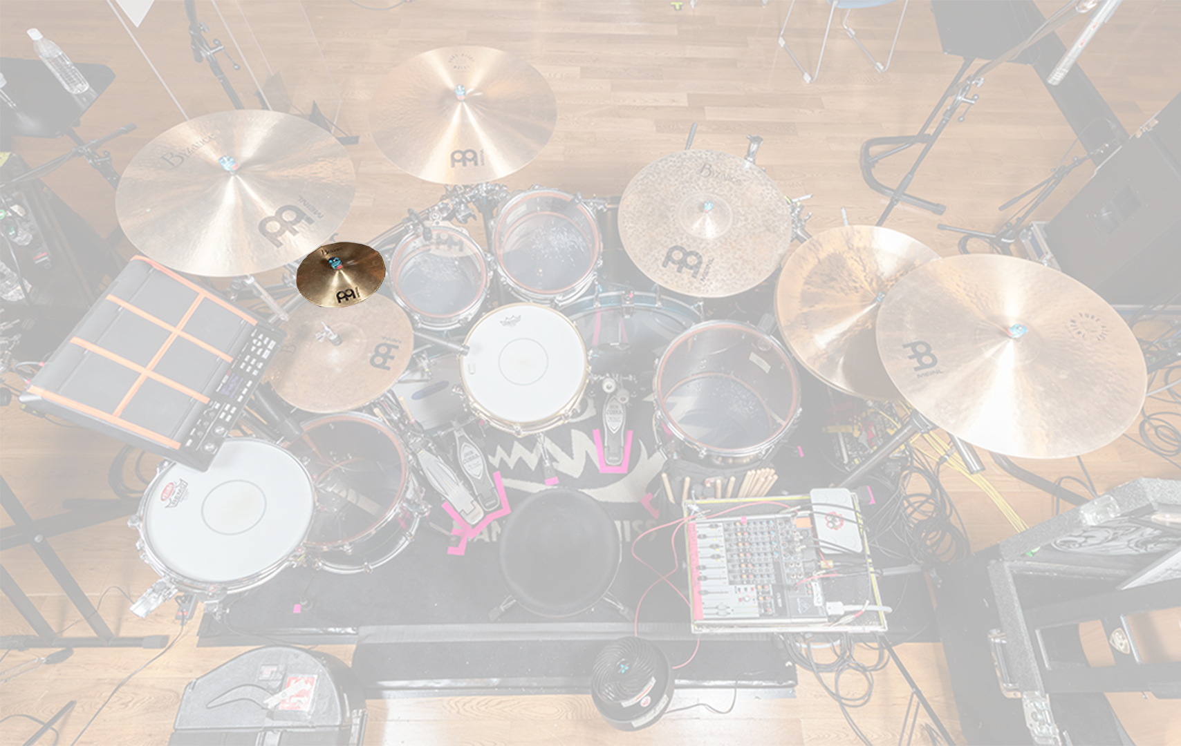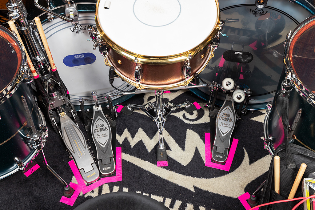セッティングにはTAMAのラックマウントシステムを使用しており、またメインのバスドラムの足にはシンバルスタンドのウェイトを乗せていたり、ルックス以外に耐久性にも着眼点を置いたセットになっているということ。
