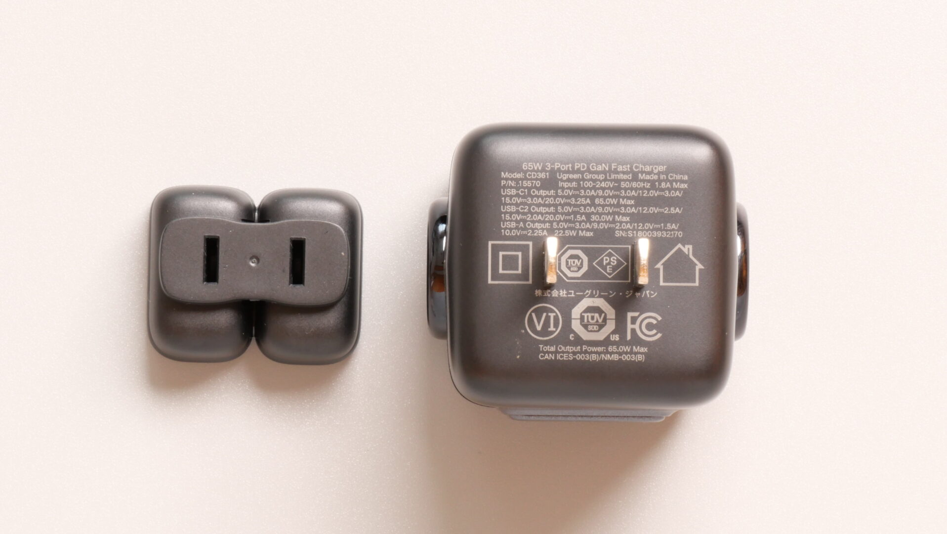 30Wのモデルとかであればちらほら似たようなモノはあるんですけど、65W出力できてUSBポートが3つあってこのサイズ感となると類似品が無いのでコンパクトで高出力な充電器を探している人はもうこれ一択なんじゃないかと思います。