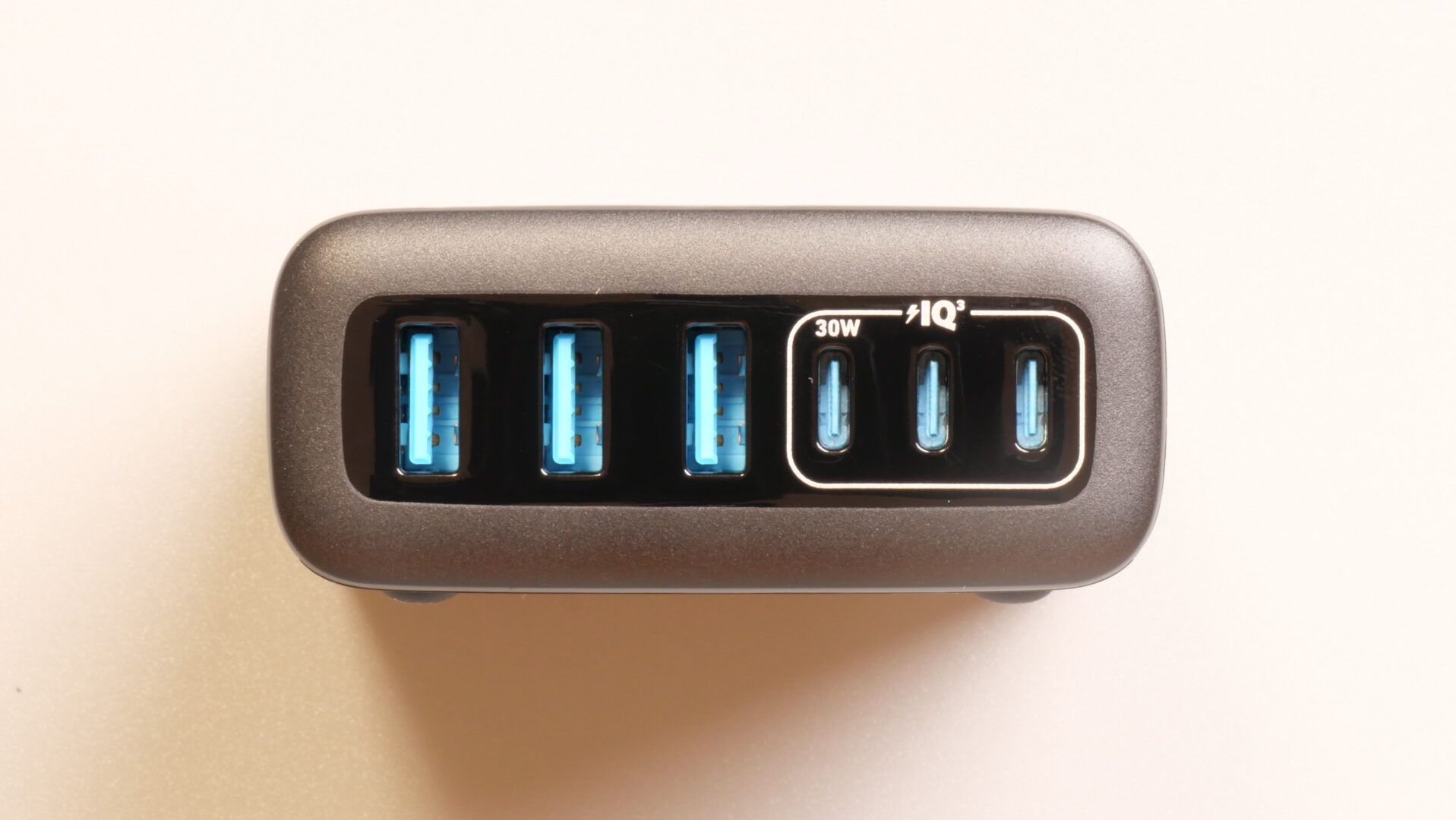 - 搭載ポートはUSB-Aが3発、USB-Cが3発の計6発でUSB-Cの1つは30Wまで出力可能
