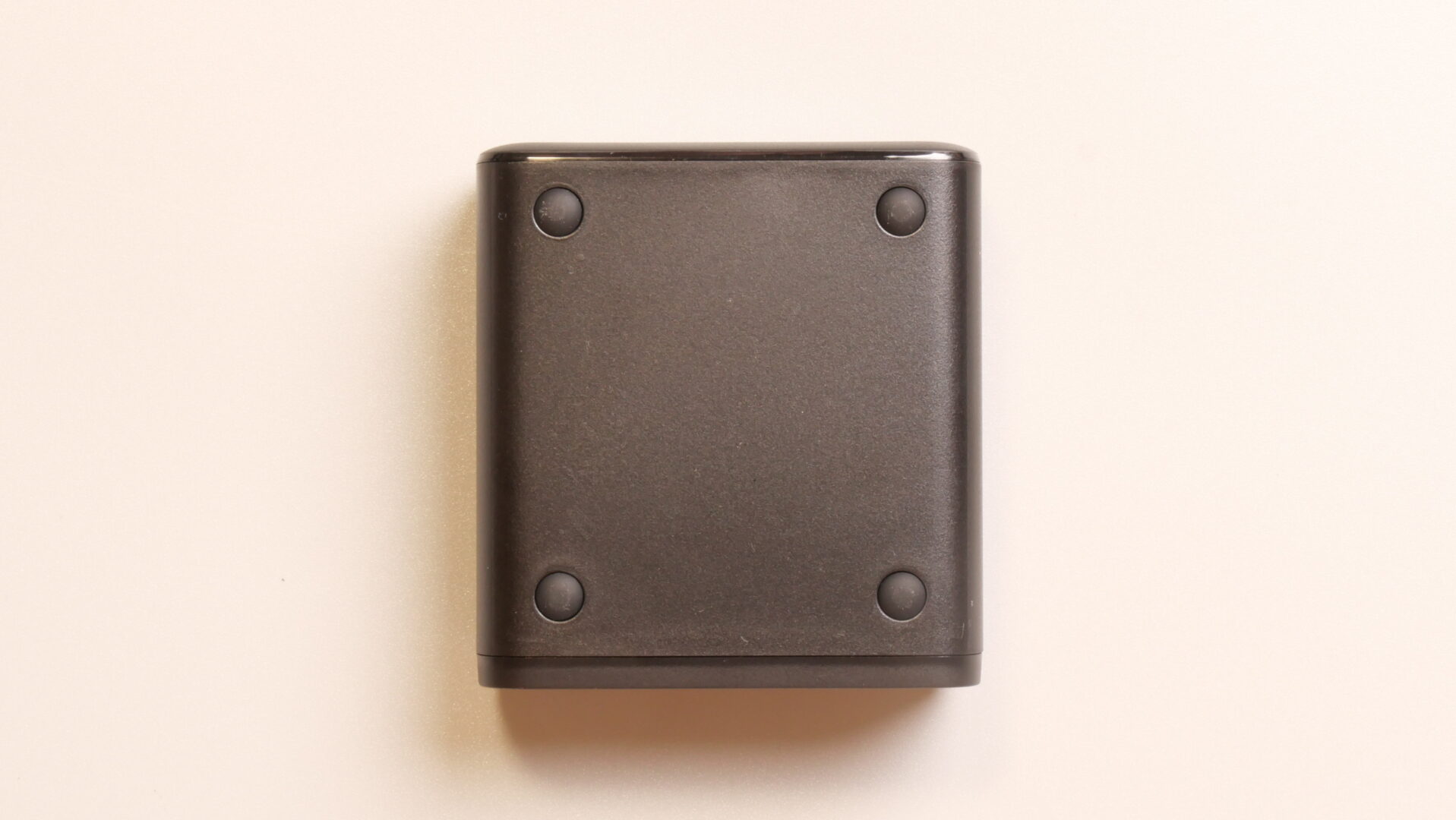 基本的に本体は横にして使うことになるのですが、底面には滑り止めのゴムが4箇所付いているので接地面に傷が付いたり、本体が動いてしまうのを防いでくれます。
